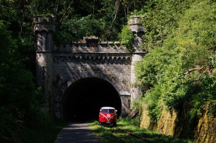 Volkswagen Nutzfahrzeuge: VW Bus Bulli T1 als Draisine auf einer Bahnstrecke am 14.05.2024 in Lengenfeld unterm Stein. Foto: Friso Gentsch/Volkswagen