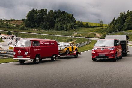 Die Marke Porsche hat sich in Österreich zum Jubiläum etwas Besonderes einfallen lassen: Sie schlägt mit der Neuinterpretation des Renntransporters eine Brücke aus der Motorsport-Vergangenheit in die Gegenwart und Zukunft: So präsentiert sich der vollelektrische ID. Buzz GTX mit Allradantrieb im ikonischen roten Dress des historischen Porsche-Renntransporters. Der Salzburgring bietet für die Premiere den idealen Rahmen.