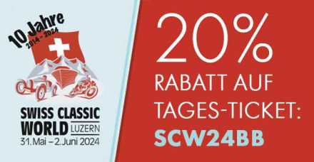 Ihr erhaltet 20% Rabatt auf das SWISS CLASSIC WORLD Tagesticket mit dem Vergünstigungscode SCW24BB. Bitte gebt diesen zu Beginn auf der Ticketseite ein, damit der Rabatt angewendet wird.