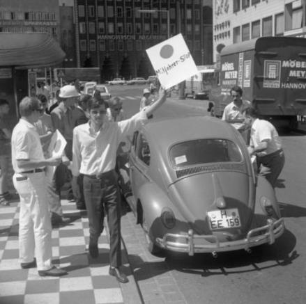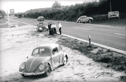Niedlich, wie sie da zu dritt für den Fotografen possieren. Wirtschaftswunderzeit, alle sind satt. Man gönnt sich was. Einen frühen Käfer, vielleicht mit Rheumaklappen? Die Damen sind happy, der Mann hat den Krieg überlebt und ein Auto und einen Fotoapparat mit Film kann man sich auch leisten. Wohin soll es also zu Kaffee und Kuchen gehen?
