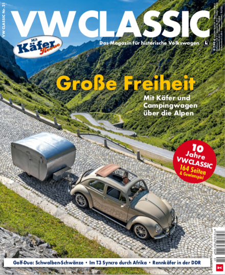Seit der letzten Ausgabe ist dss VW Classic Magazin mit der Käfer Revue vereint. Drückt sich erstaml im Umfang des Heftes aus, thematisch spielt der Käfer sicher eine grosse Rolle, aber er dominiert die Ausgabe nicht, auch wenn die Titelstory einem ganz speziellem Dickholmer Käfer aus der Schweiz gewidmet ist, der dank 2,2-Liter Motor im Heck und entsprechenden Anpassungen auch als Gespann auf der Gotthard Passstrasse nicht schlapp macht. Mit dem Klassiker reisen, dank des zeitgenössischen Dethleffs Gespanns sind der Freiheit keine Grenzen gesetzt.
